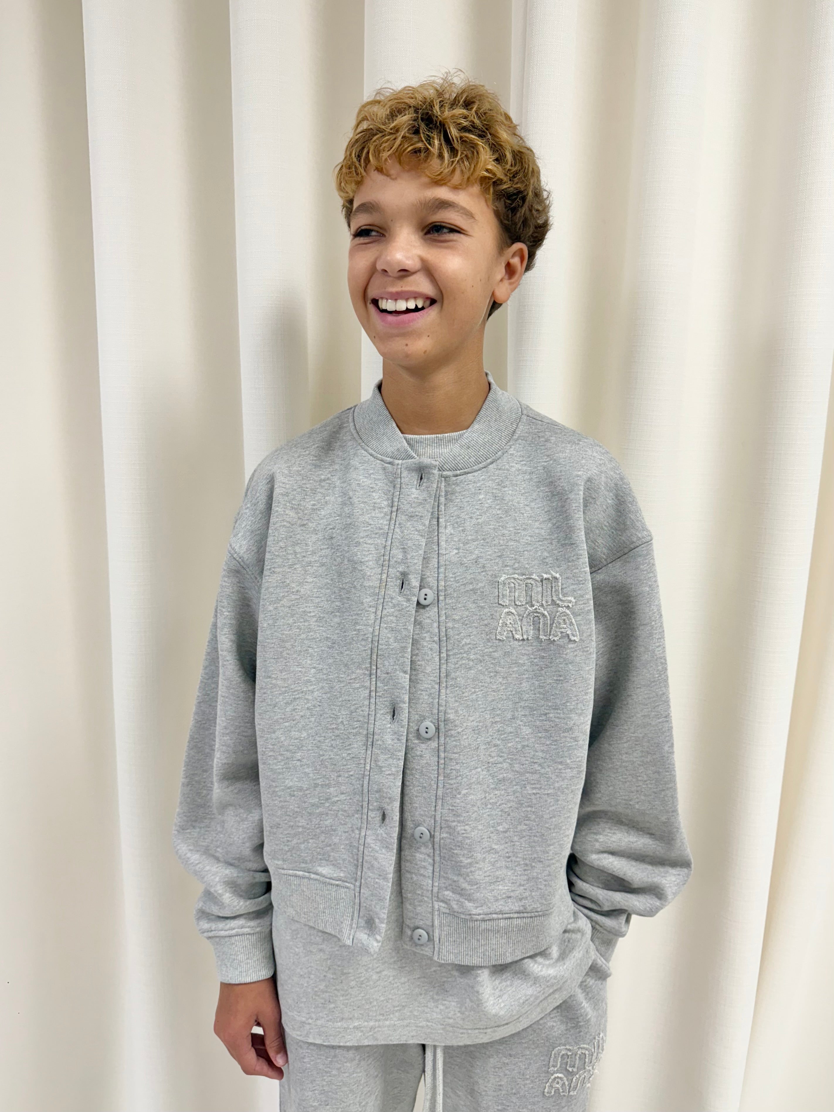 Introducing the Mini Milana Marl Grey Bomber Jacket, matching our adults range. Coming in our premium heavyweight fabric, button up and usual oversized fit. Pair with the matching sweatpants to complete the look.
