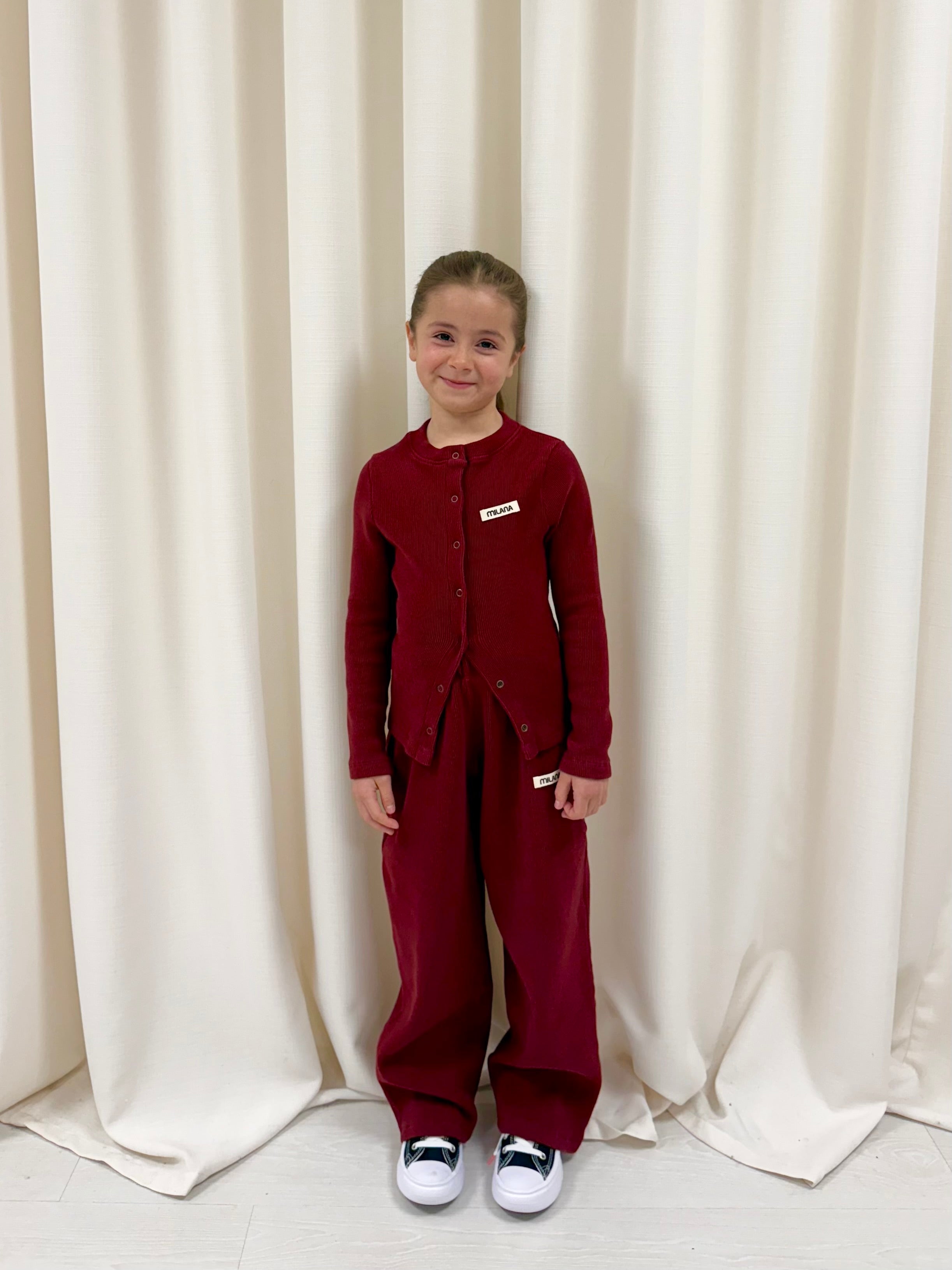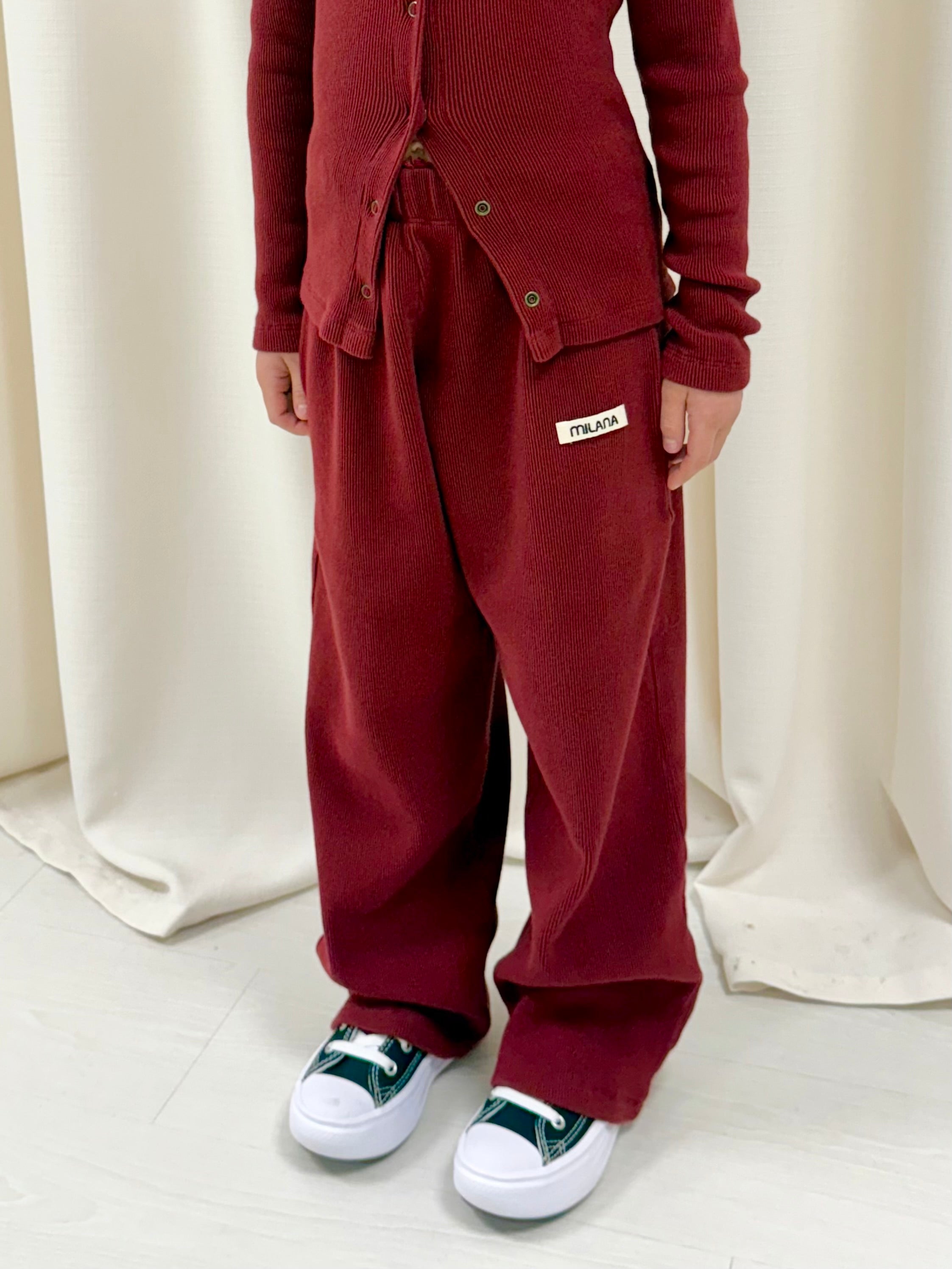 Your favourite ribbed set is now available in mini sizes – because comfort and style shouldn’t be just for grownups. The ribbed sweatpants have a relaxed fit and drawstring waistband for easy movement and all-day play.Made in our signature soft rib and finished with our core label, this Burgundy set is cozy enough for lounging and cool enough for out-and-about.