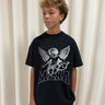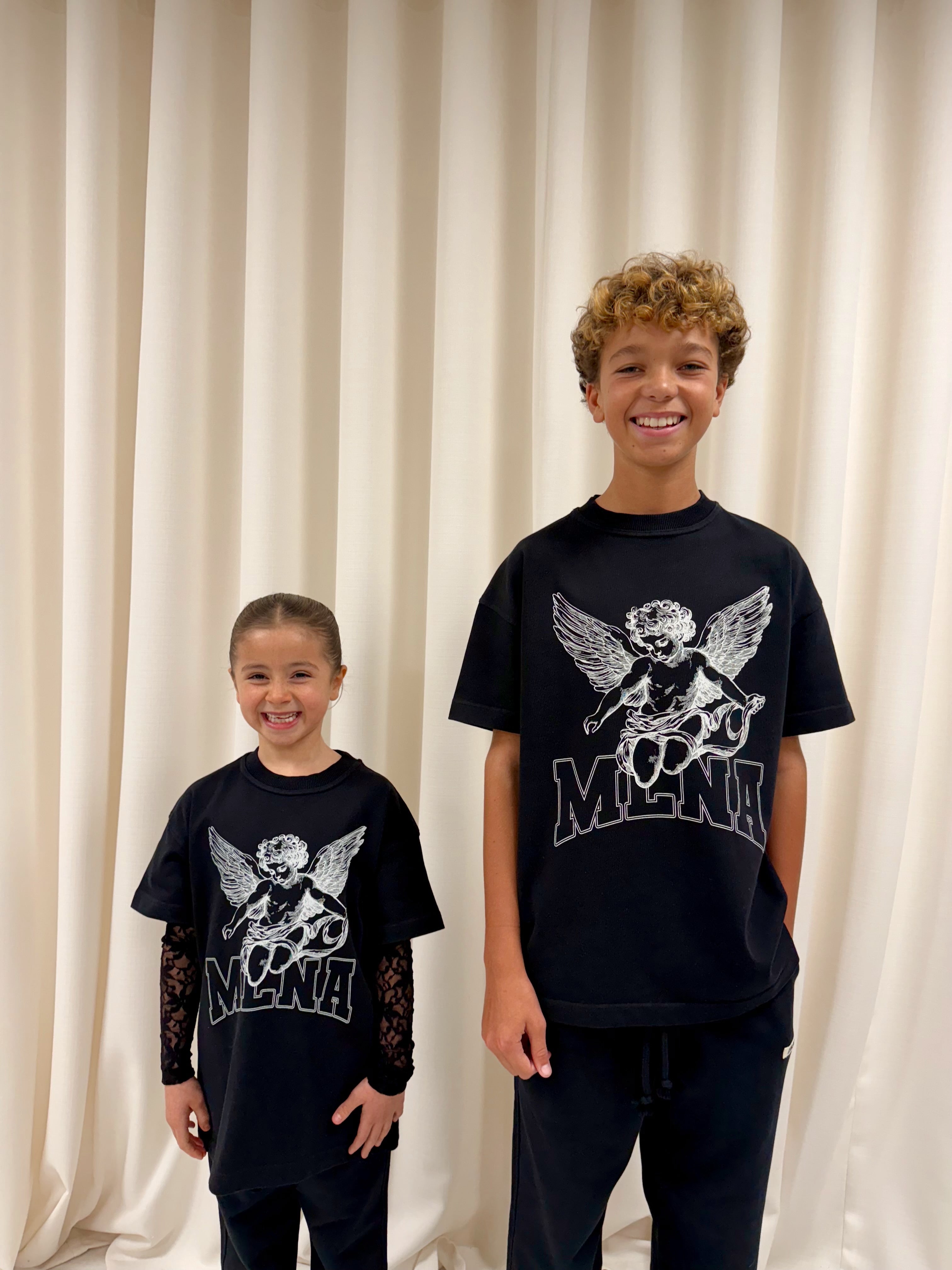 Introducing our Black Stencilled Cherub Kids T-shirt. The newest addition to our mini Milana collection, matching our adults collection. Add a little edge to your mini's wardrobe with the stencilled cherub print, a timeless graphic that will never go out of fashion. Coming in our premium heavyweight fabric, made to last.