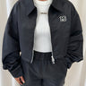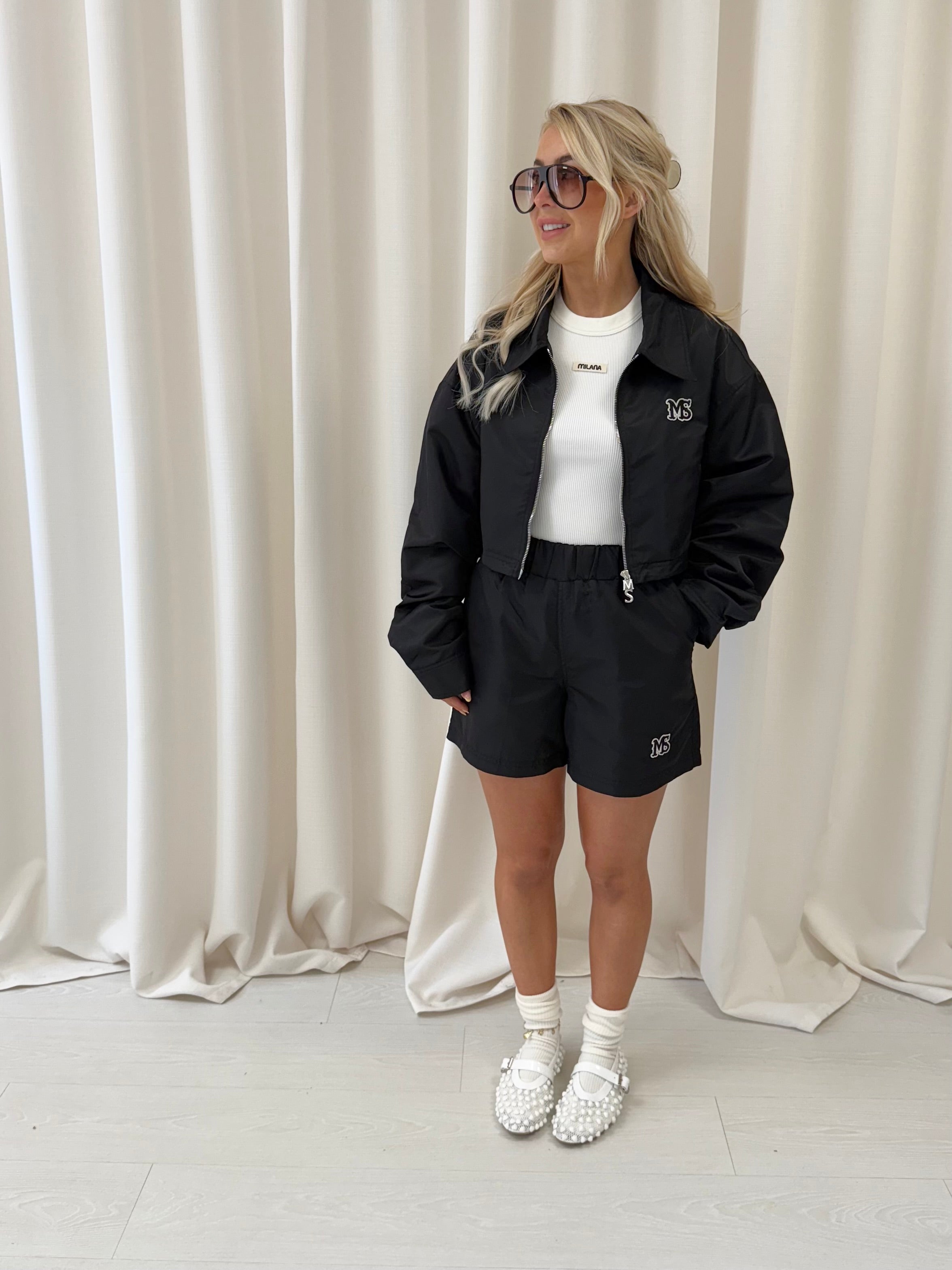 Our Black MS cropped Nylon jacket is here! Oversized, long sleeved with a shirt collar and our signature MS two way zip. Adjust the hem with the elasticated drawstring. Pair with the Nylon mini shorts for the ultimate summer staple or add your favourite heels and jewellery for an evening dress up.