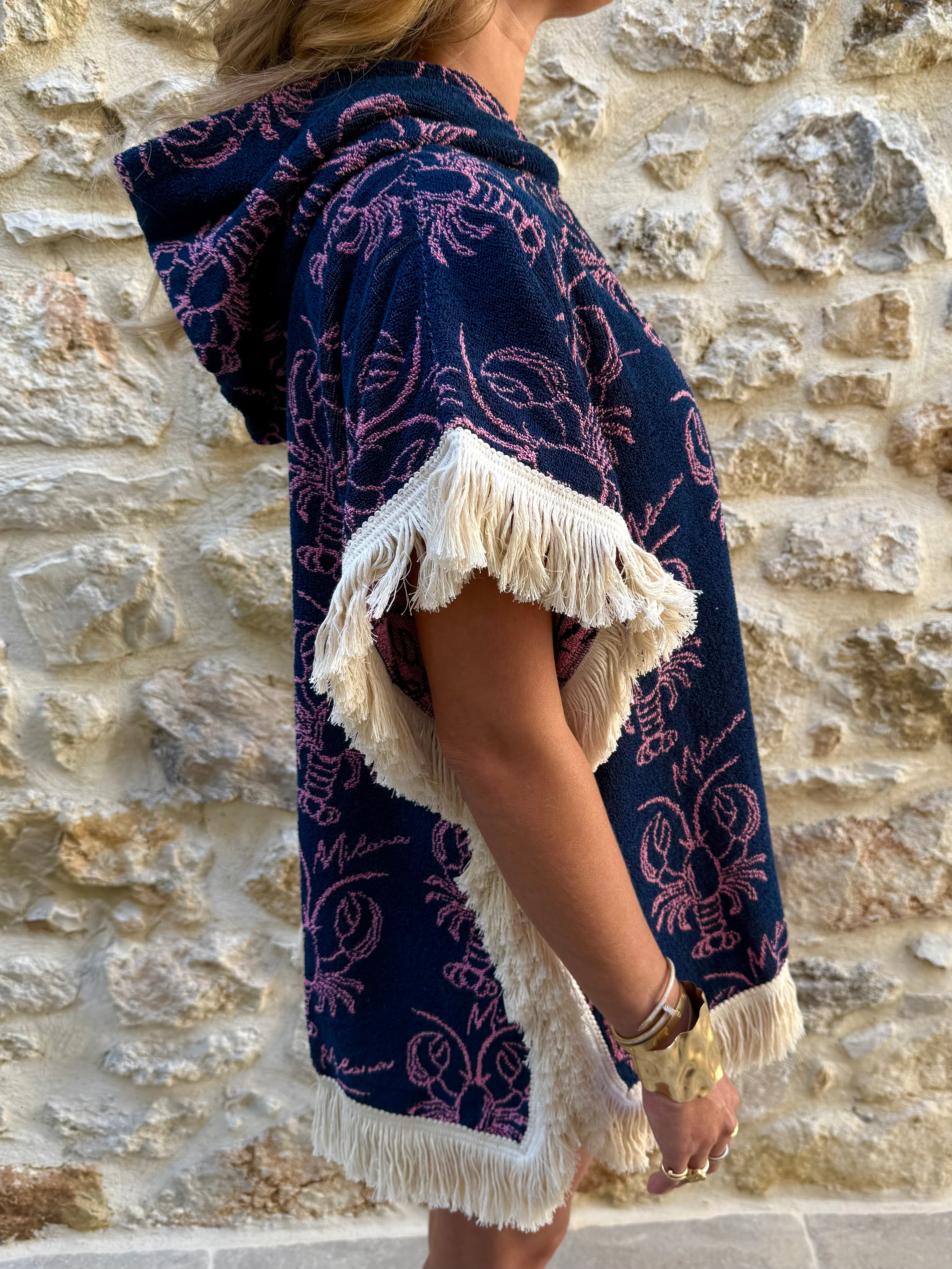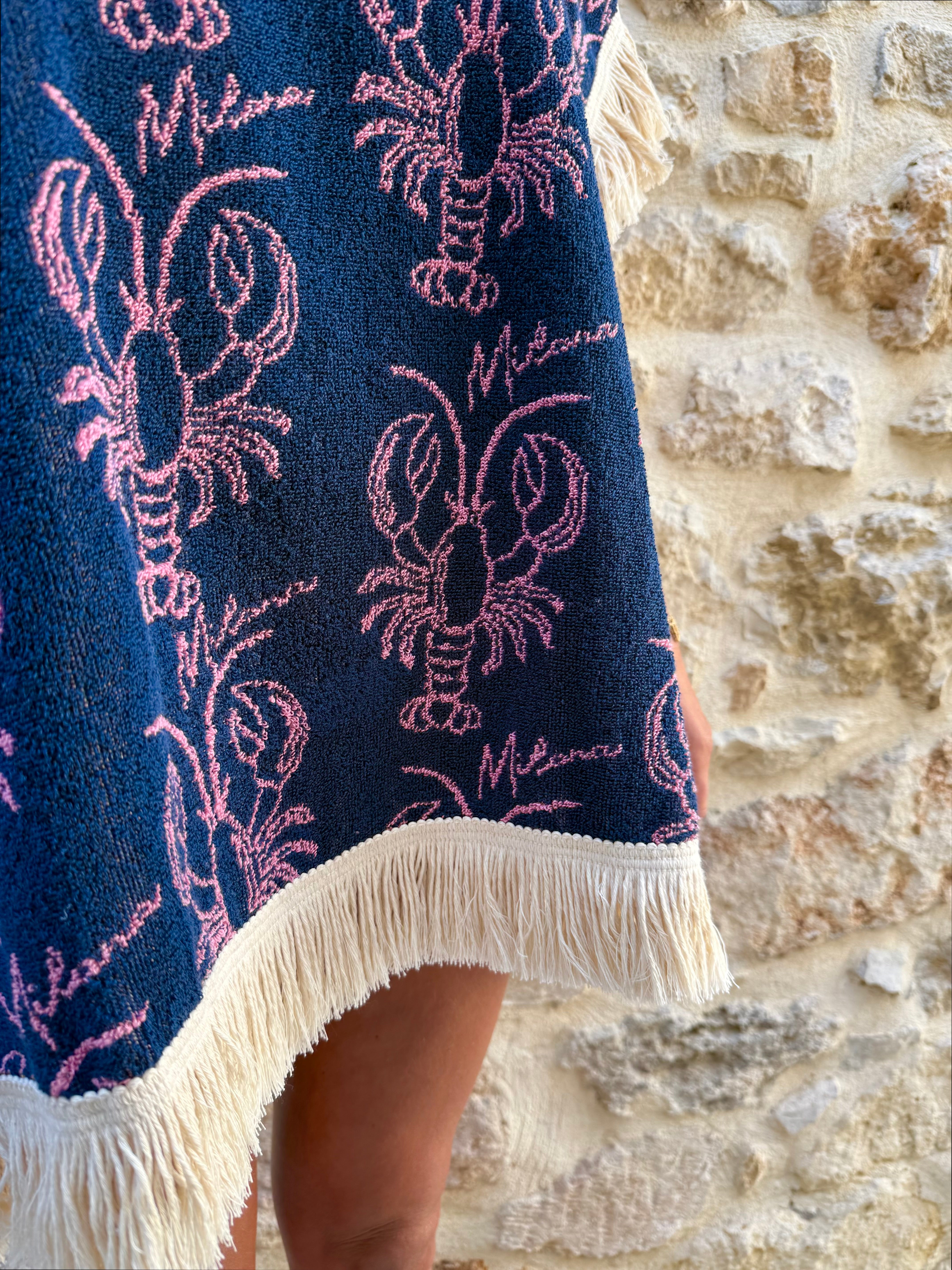 Breakfast to Lunch or Beach to Brunch... Introducing our Towelling Poncho, by far the comfiest and most luxury beach cover up, that can also be dressed up with a little heel for an effortless evening outfit. Navy with an all over Pink Lobster design completed with tassels and hood. Pair with the matching tote bag to complete the set.