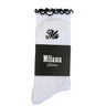Milana Studios White Milana Frill socks, with Black logo print.