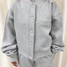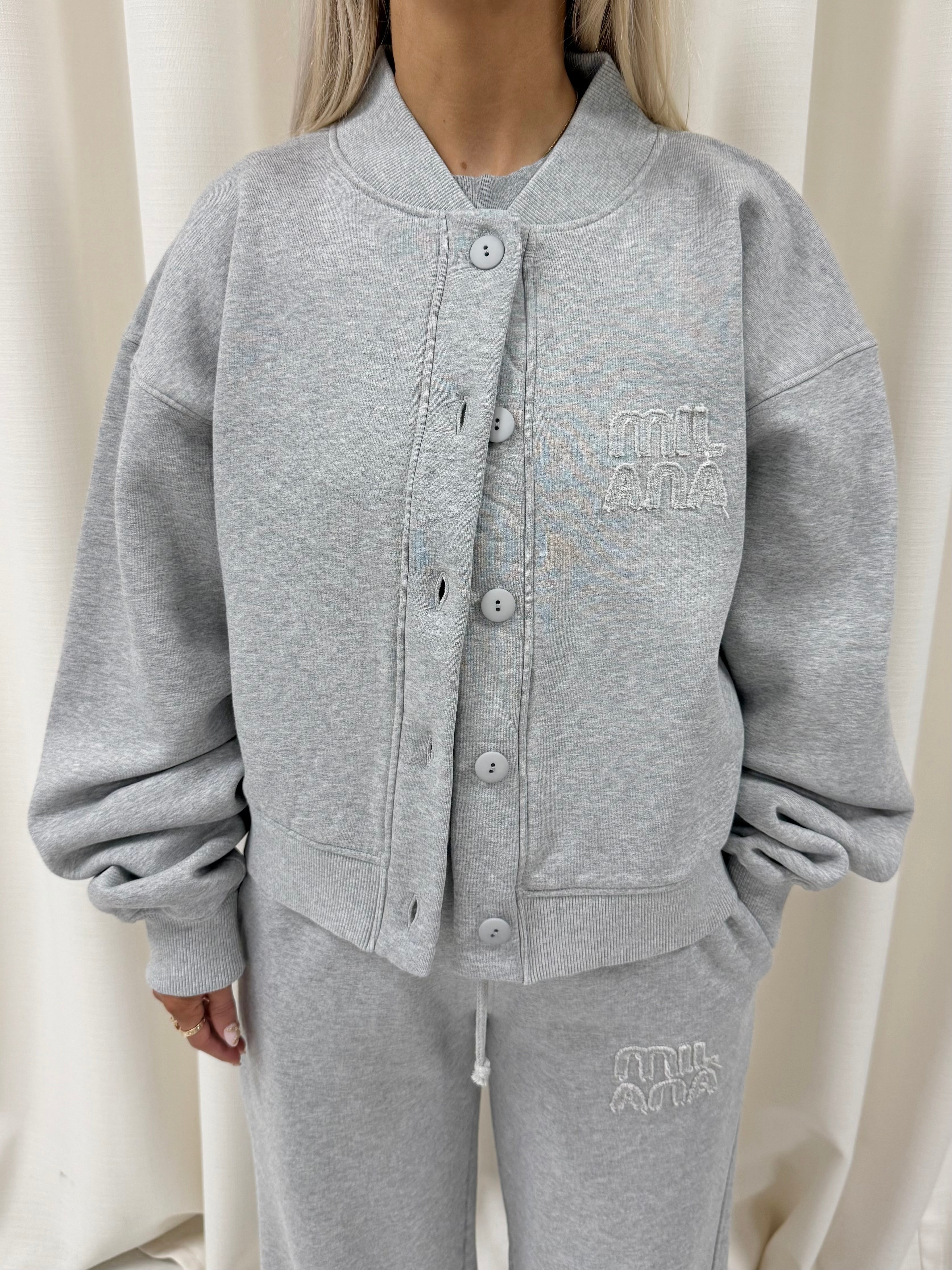 The Marl Grey Heavyweight jersey bomber jacket has landed. One of our favorite colours this season has arrived in one of our most popular jackets. The design is complete with a side chest appliqué Milana logo, introducing a subtle yet distinctive statement of identity. The button-up front replaces the traditional zipper for a more elevated aesthetic, while the ribbed collar, cuffs, and hem maintain the bomber’s timeless shape.