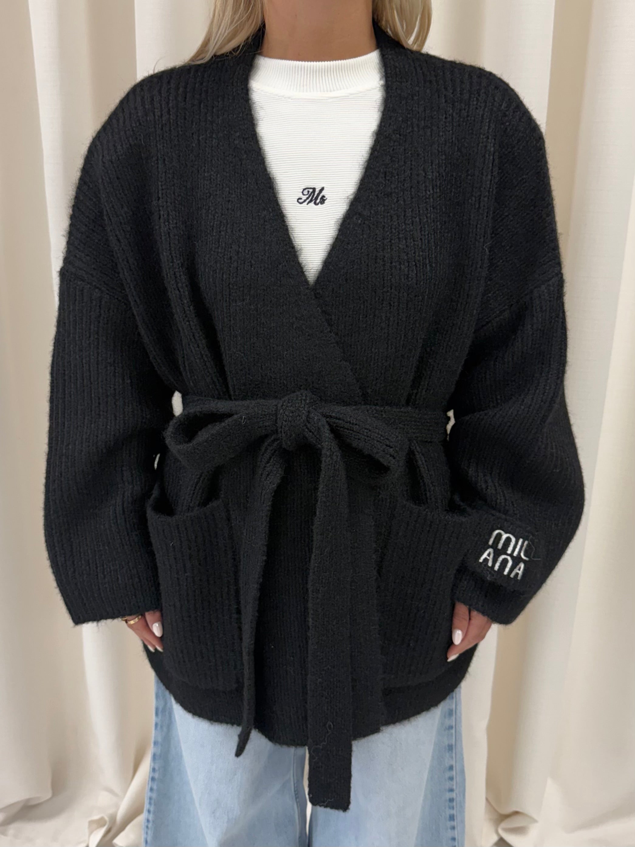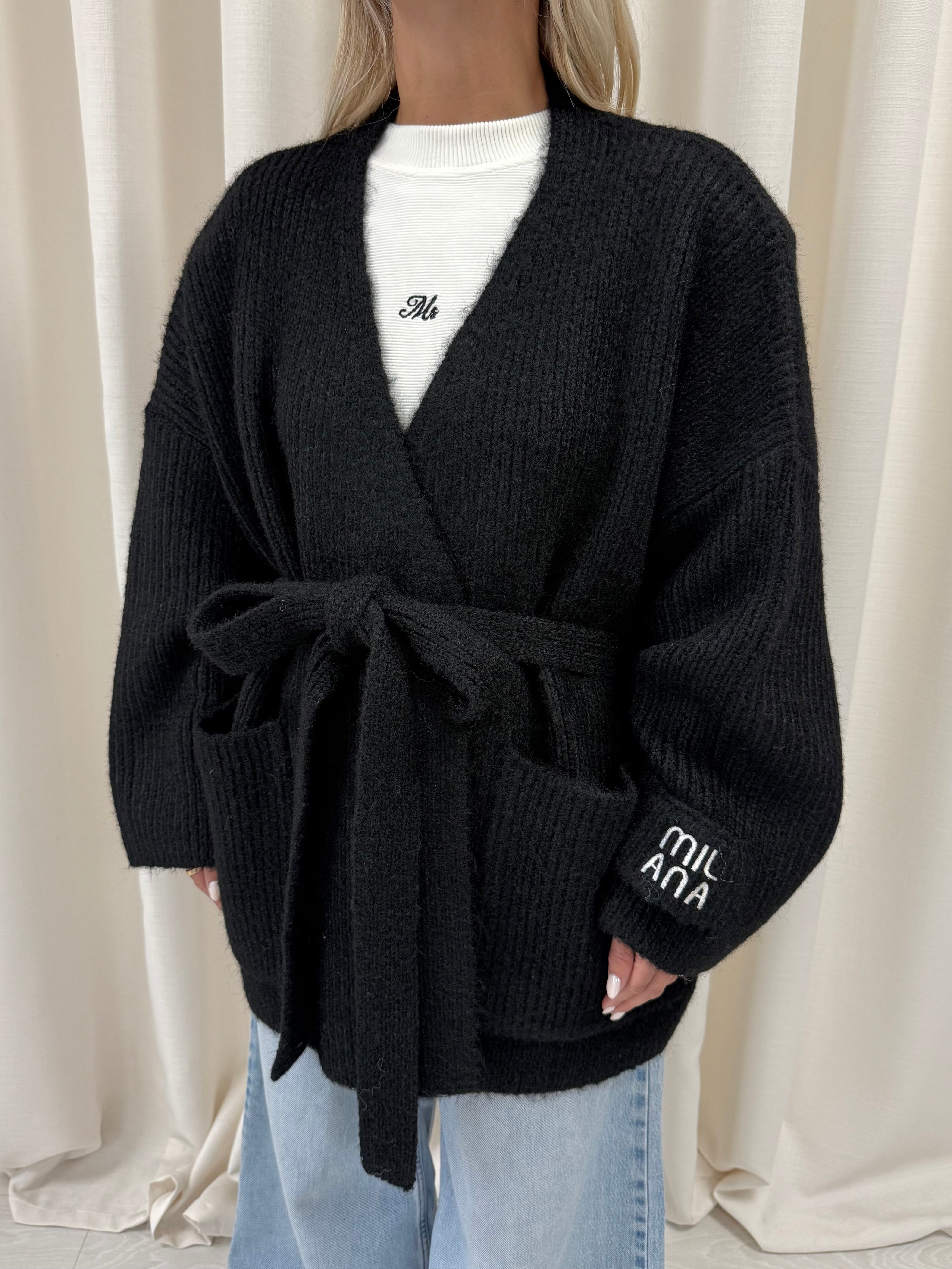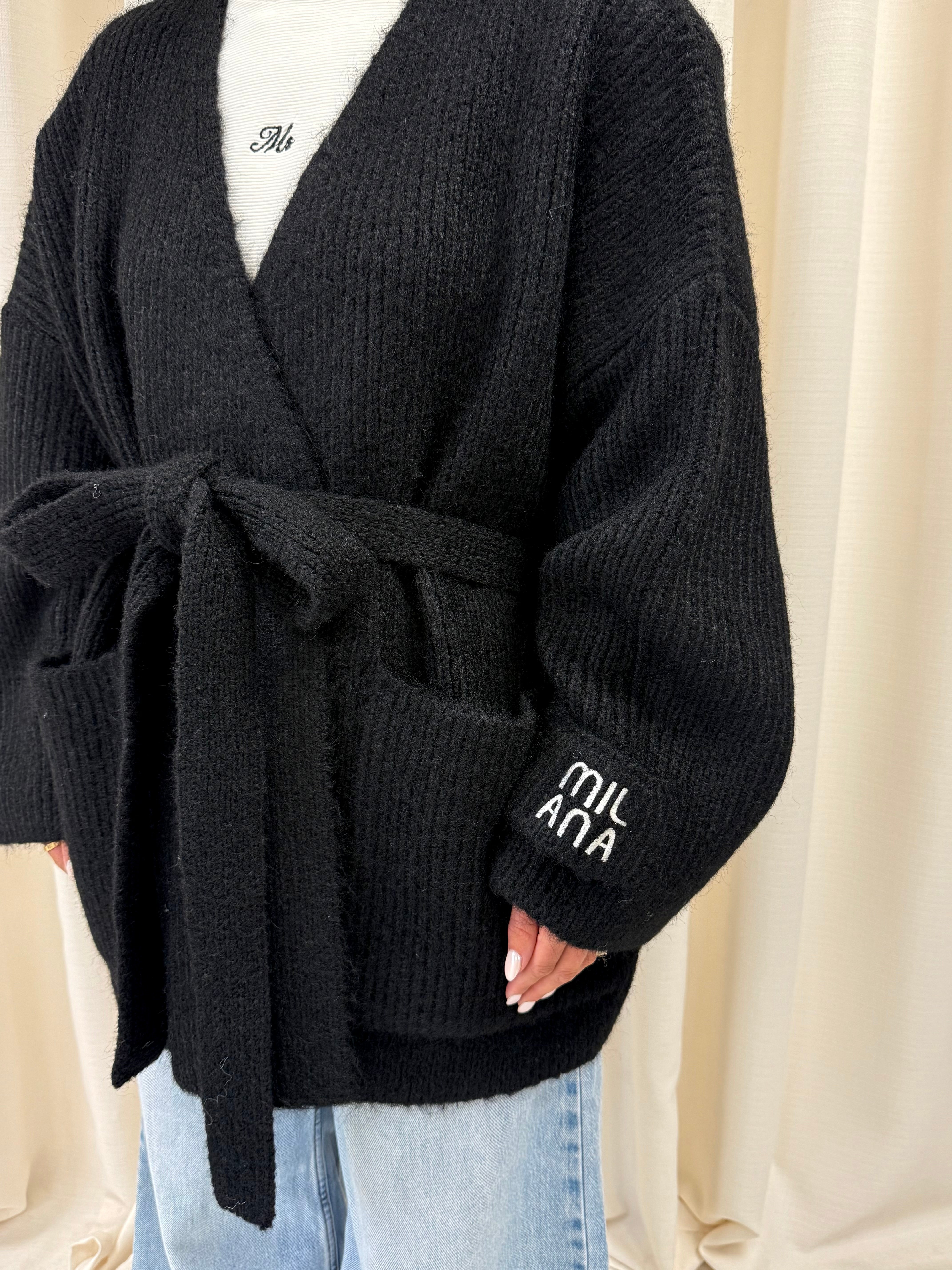 Meet the cardigan you’ll reach for all season, our Black Chunky Knitted Wrap Cardigan. New for AW25 its Milana’s softest, warmest knit yet. Crafted in our newly upgraded wool-blend yarn, designed with a wrap-around tie belt for an adjustable, flattering fit. Complete with our signature Milana patchwork logo on the sleeve, it’s the ultimate throw on and go layer, effortlessly cosy, endlessly wearable, and made to last.