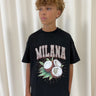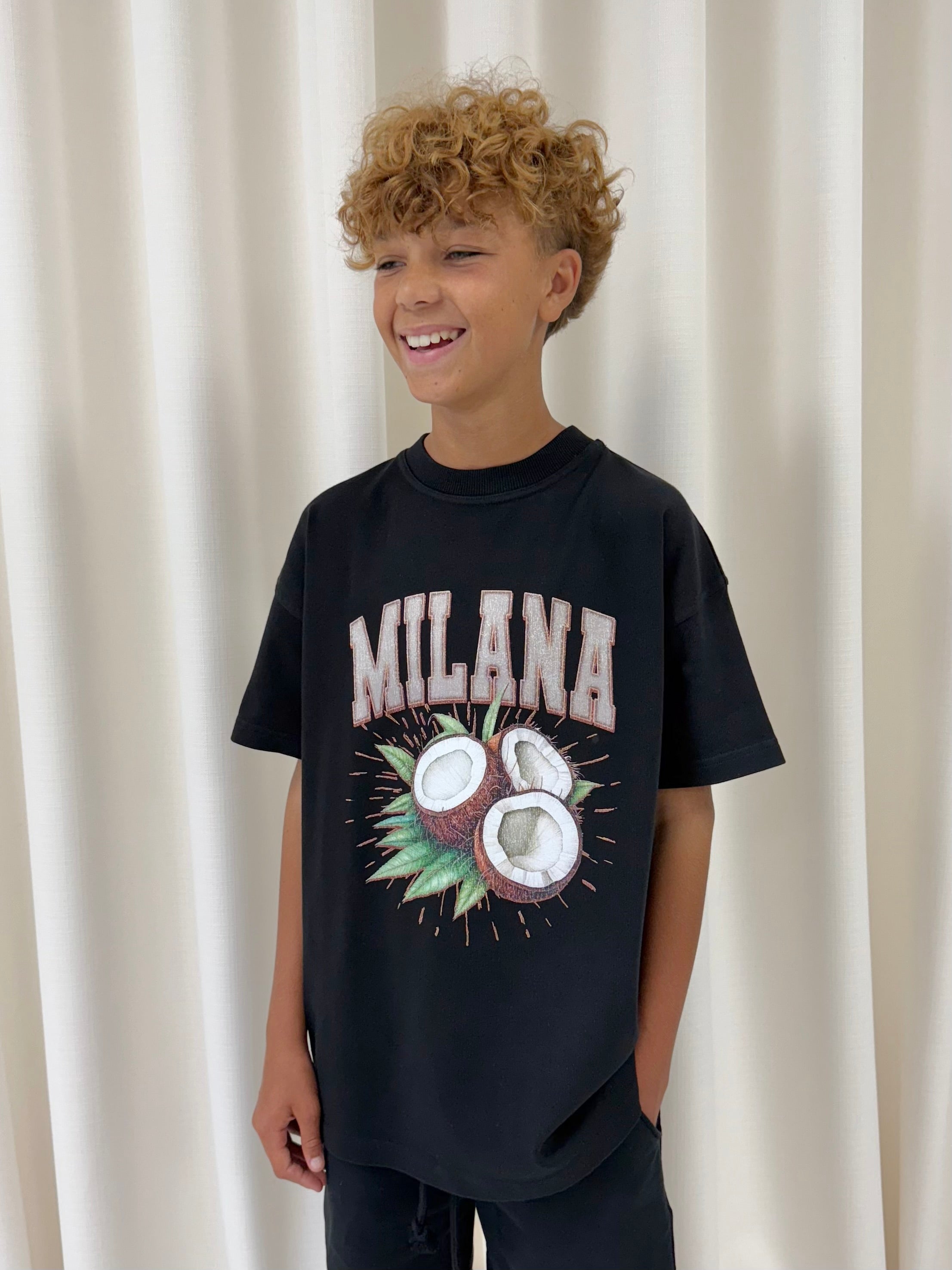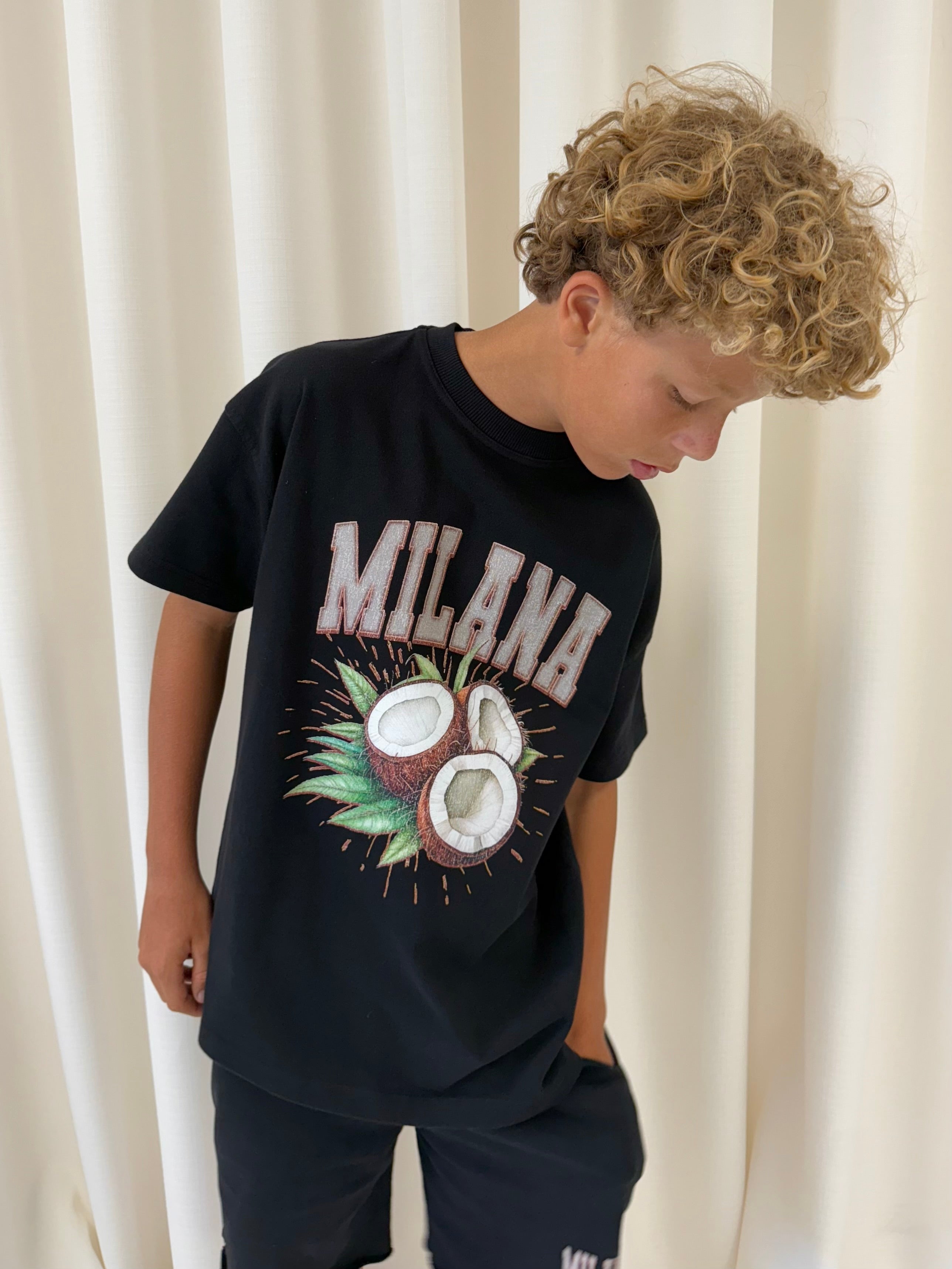 Mini Milana Studios Black Coconut T-shirt. Crafted into a box fit, dropped shoulder, oversized fit to match our adults range. A new addition to our fruit collection, with matching t-shirts and shorts. Also available in adults sizes to match with your little ones.