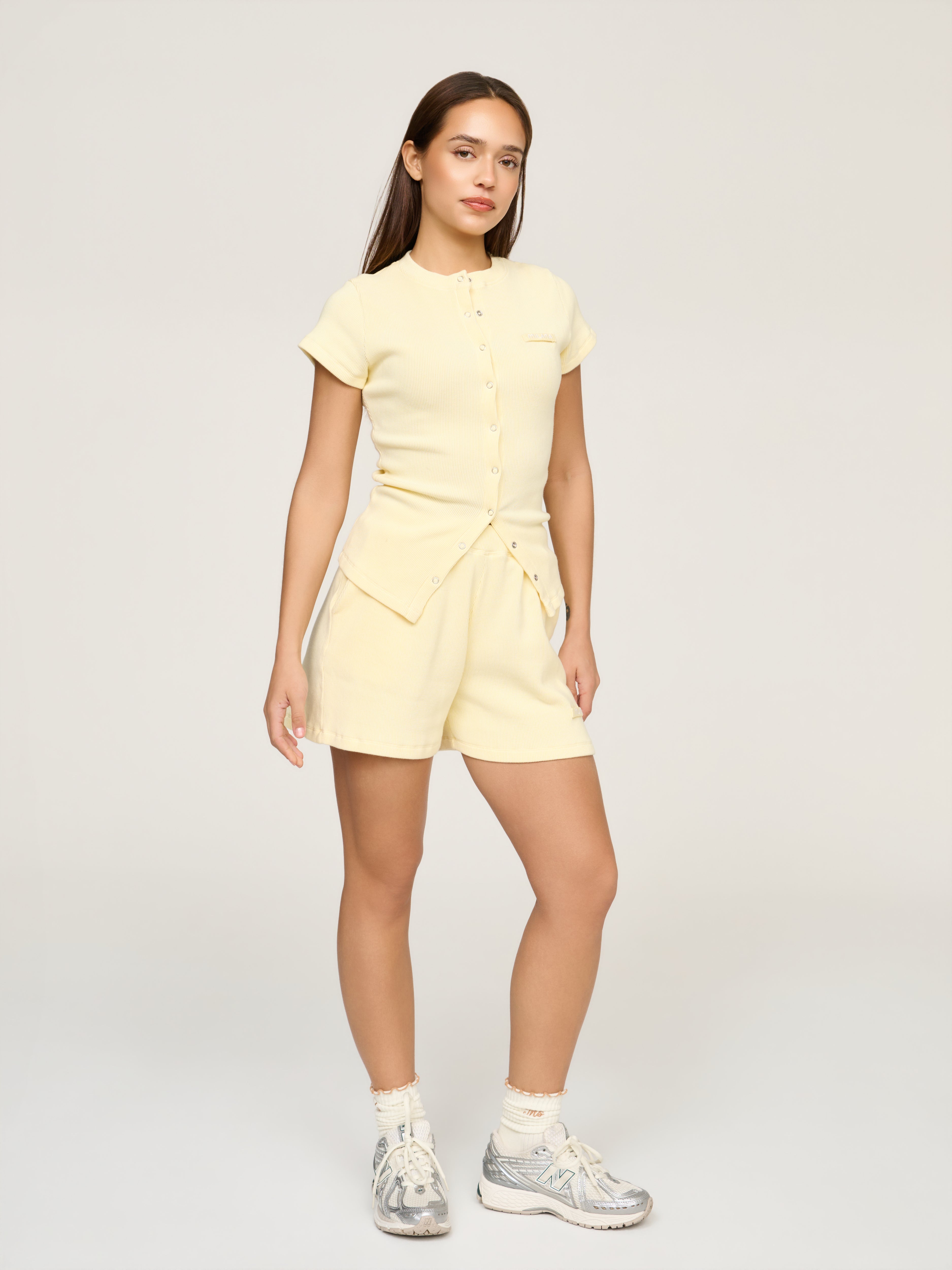 Our best-selling Soft Rib fabric now arrives in a Baby Tee and short set.... Introducing our soft rib core mini shorts, our most comfy shorts to date. Crafted into a looser fit with a slightly higher and elastic waistband and completed with our Milana Core Canvas Patchwork and pull cords. Pair with our Soft Rib Button Baby Tee for the ultimate any occasion outfit.