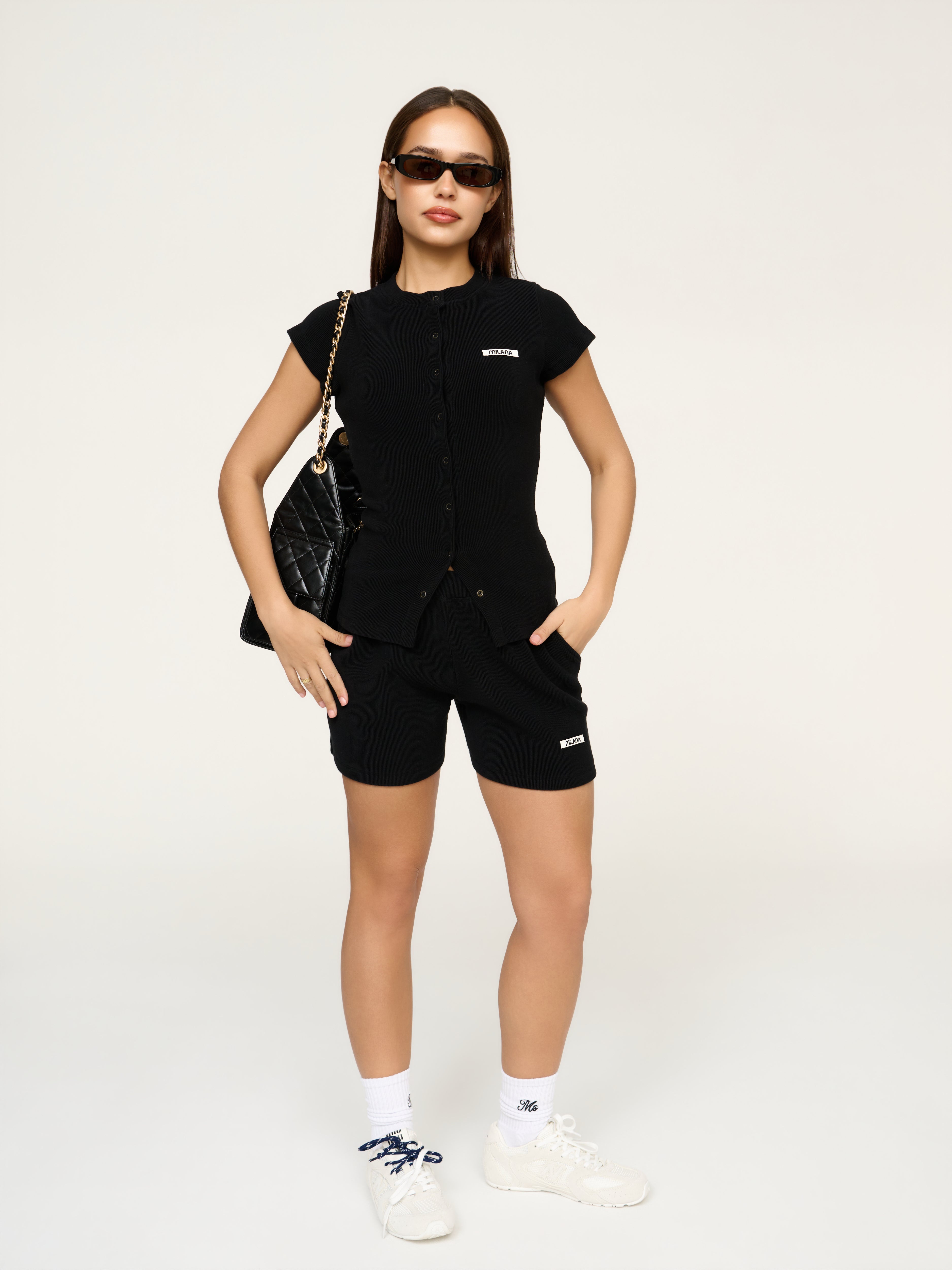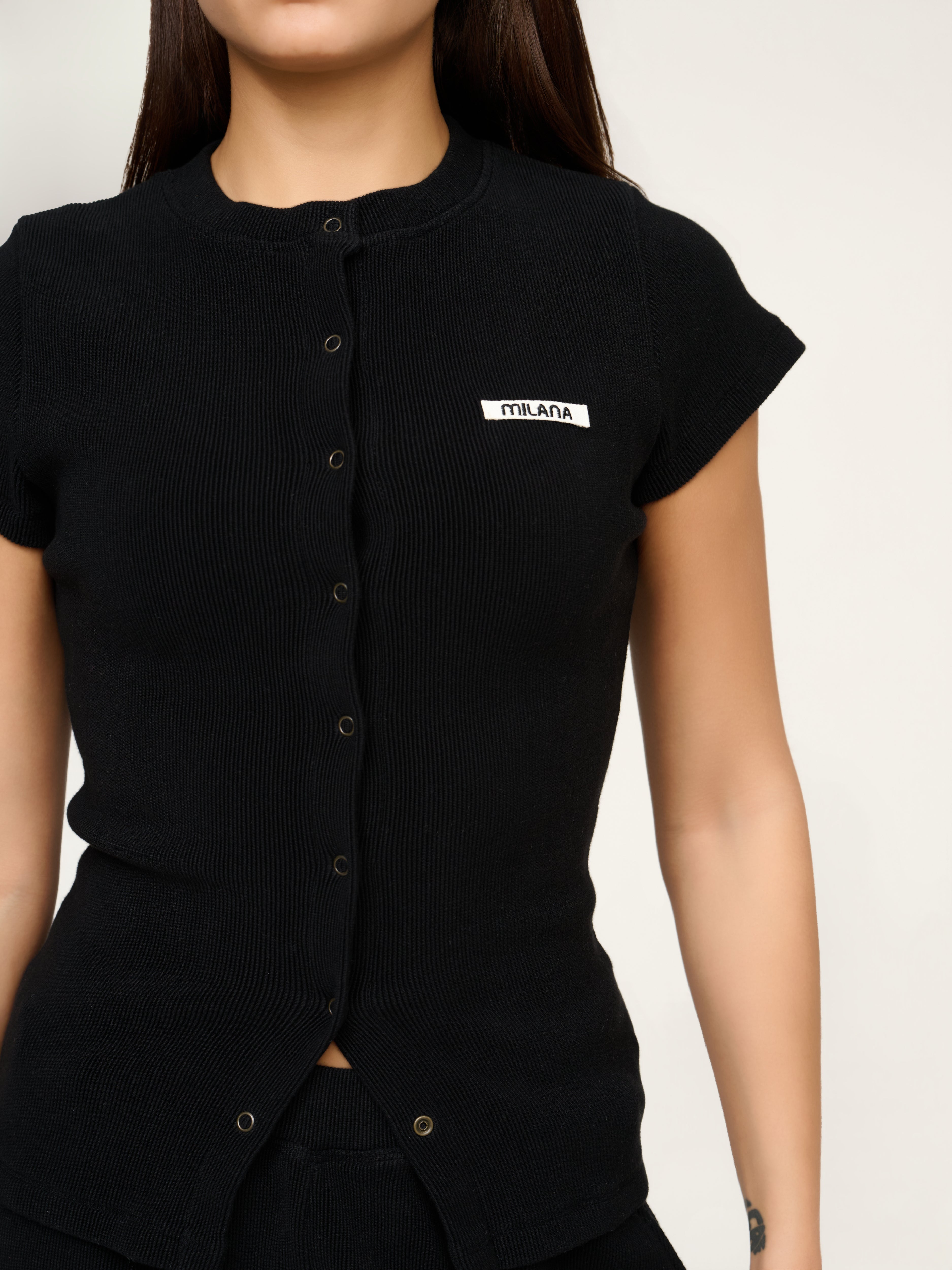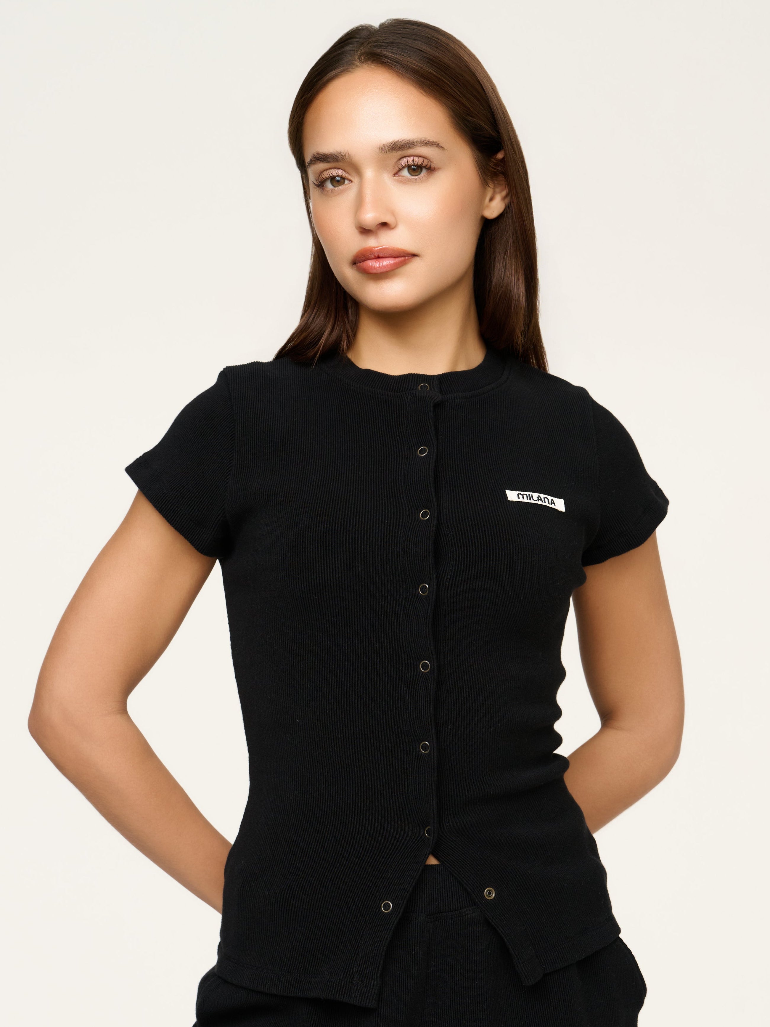 Our most-loved Soft Rib just got an upgrade. Say hello to the Black Soft Rib Core Button Baby Tee. A fresh take on our signature long sleeve, reimagined with a flattering short sleeve fit. Designed with our signature Milana Core Canvas Patchwork and strong snap buttons that can be altered for your desired fit. Pair with our Soft Rib Shorts for a look that works for any occasion.