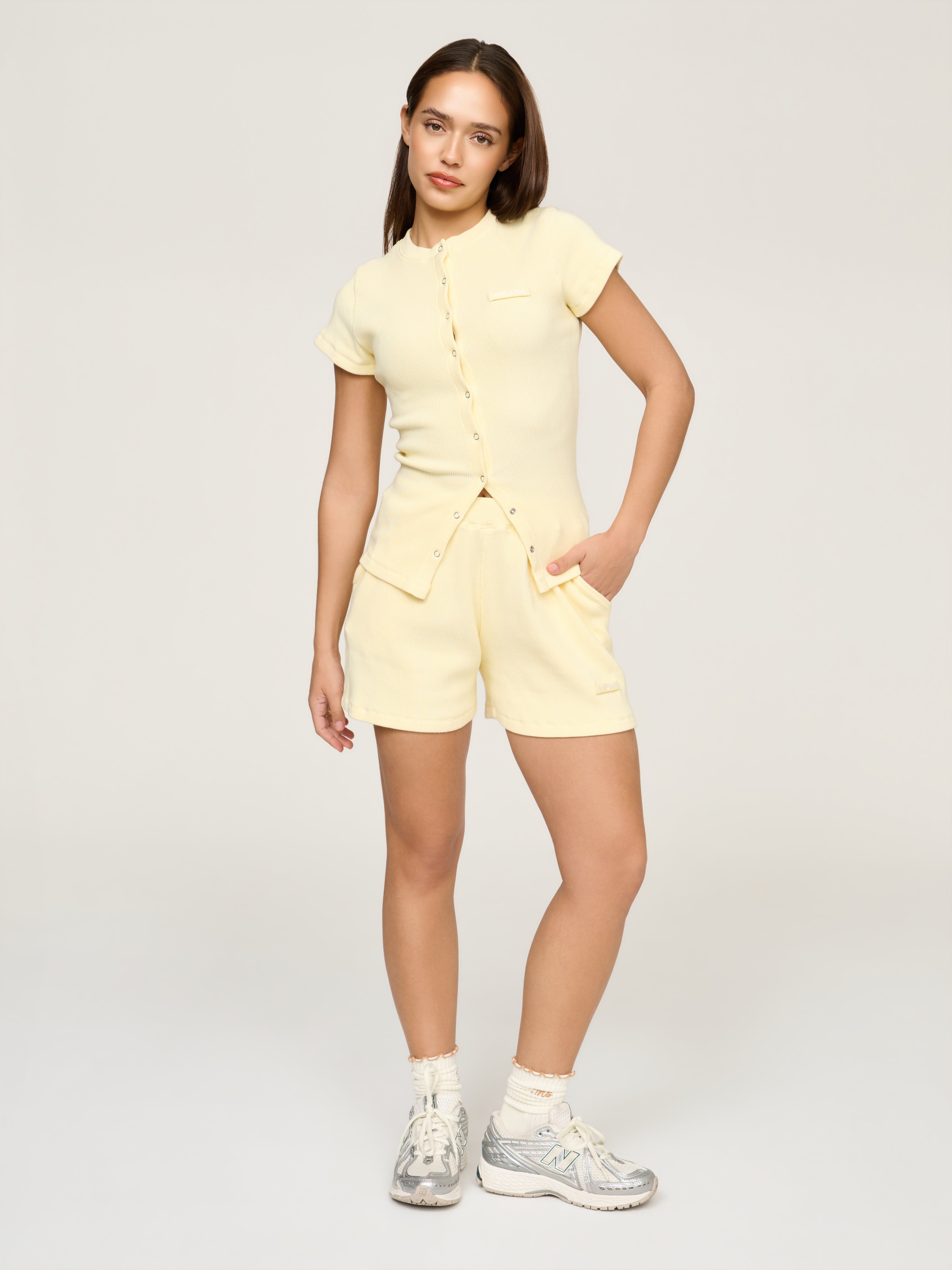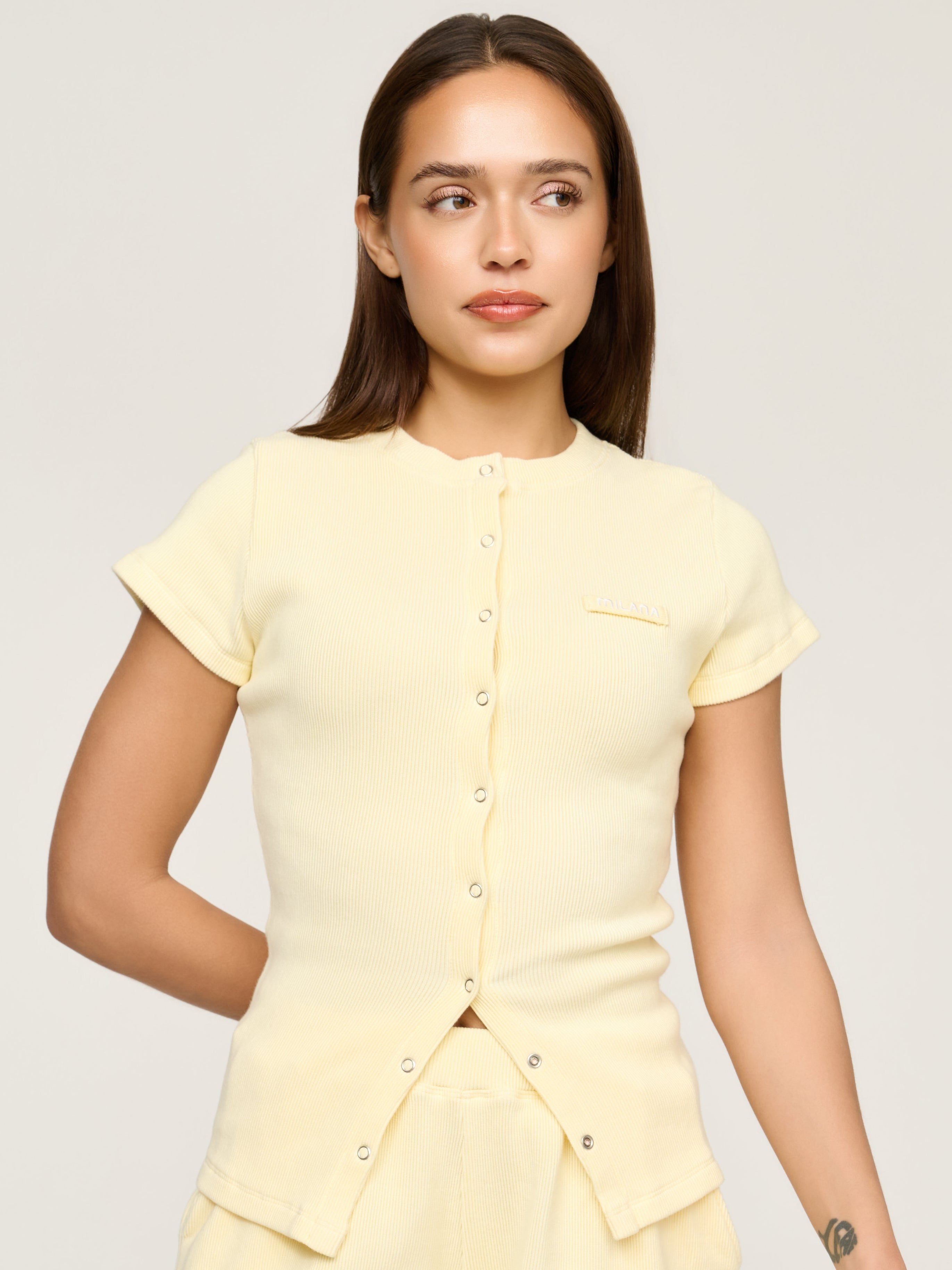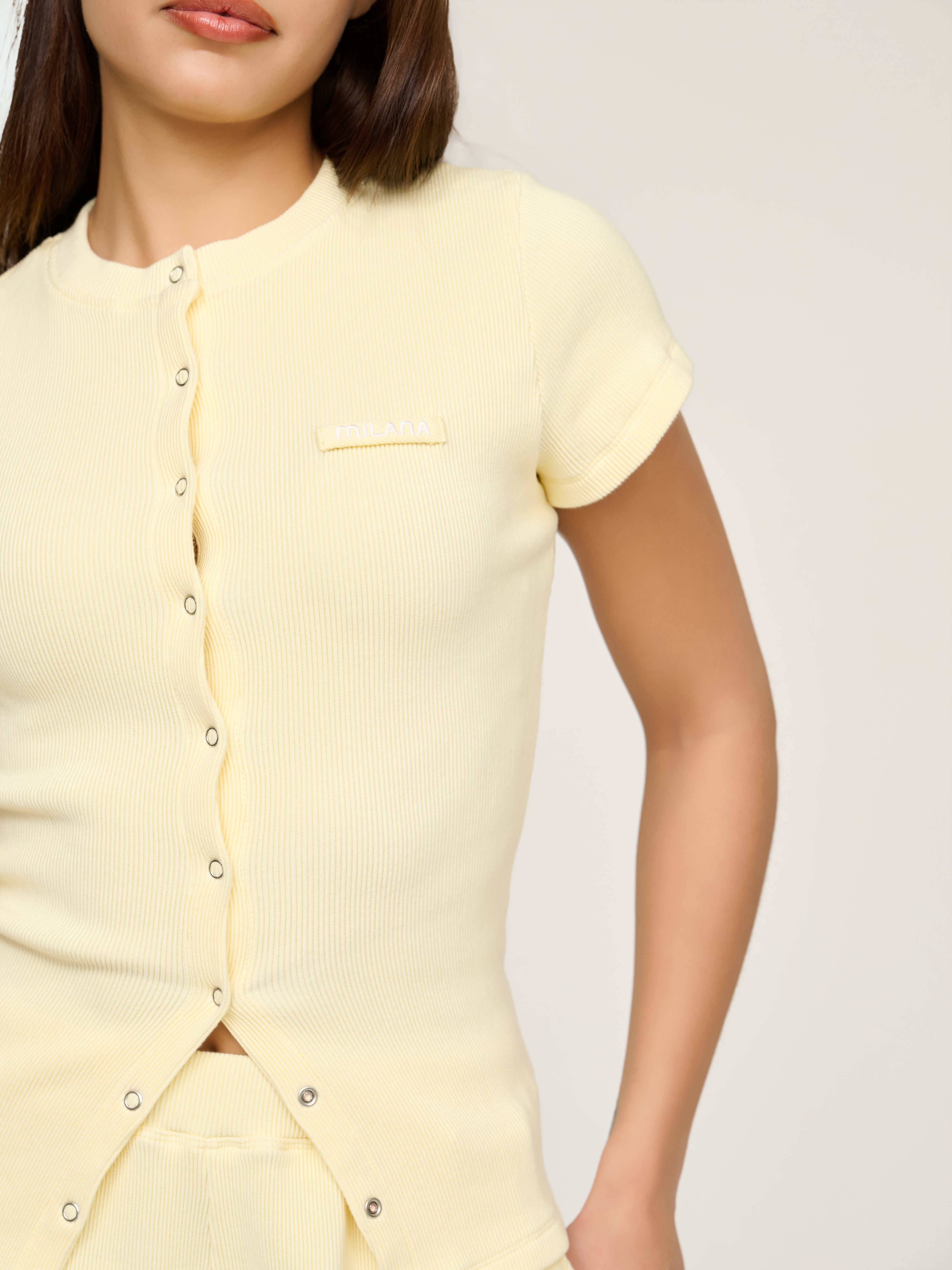 Our most-loved Soft Rib just got an upgrade. Say hello to the Lemon Soft Rib Core Button Baby Tee. A fresh take on our signature long sleeve, reimagined with a flattering short sleeve fit. Designed with our signature Milana Core Canvas Patchwork and strong snap buttons that can be altered for your desired fit. Pair with our Soft Rib Shorts for a look that works for any occasion.