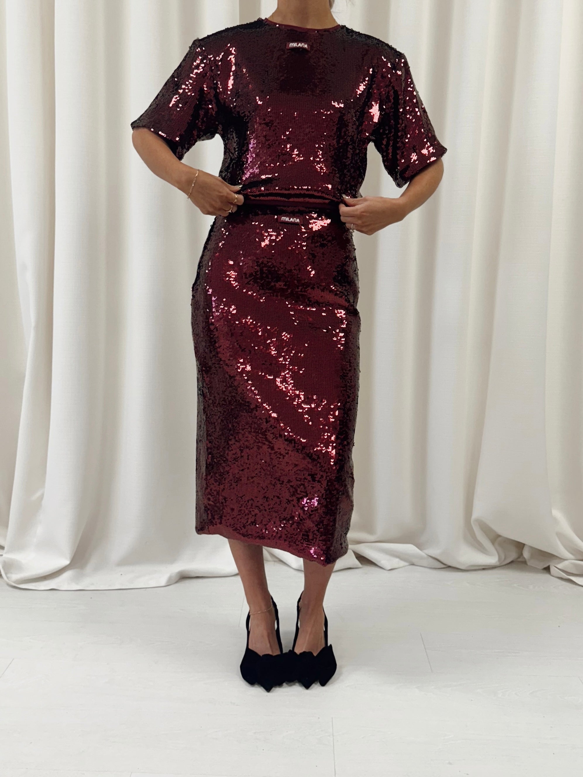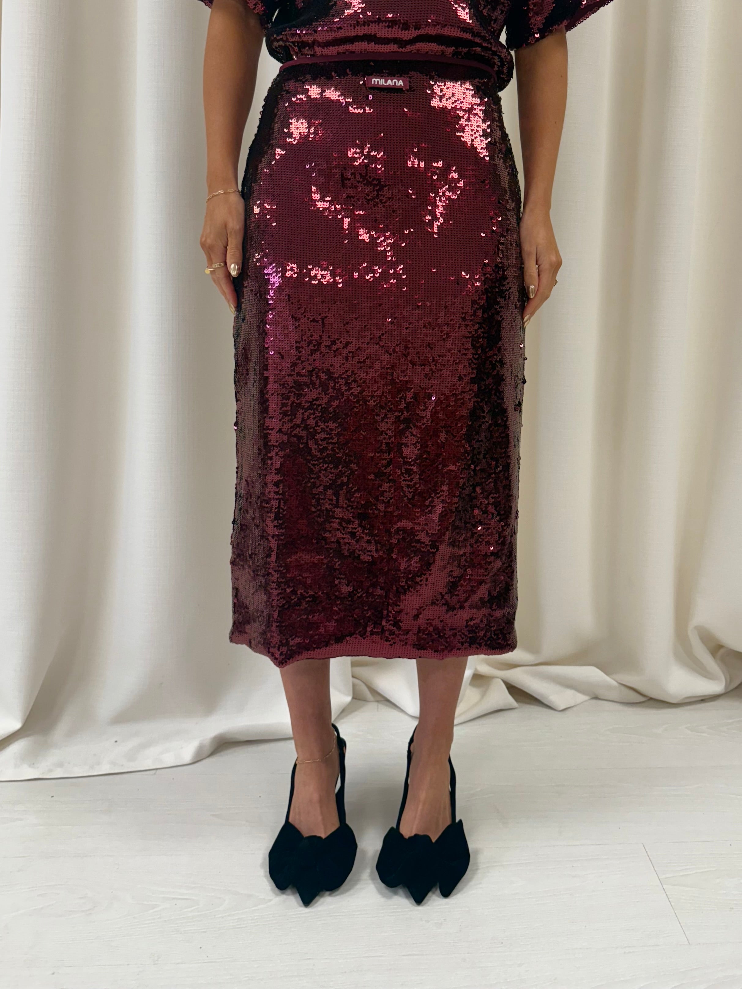 Sparkle from every angle in our Burgundy Sequin Midi Skirt designed to add instant glam to any outfit. Featuring the signature Milana logo - perfect for turning heads at parties, nights out, and special occasions. The hidden side zip stays out of sight while keeping the skirt perfectly fitted. For a styled look pair item with our Burgundy Aura Sequin Tee.