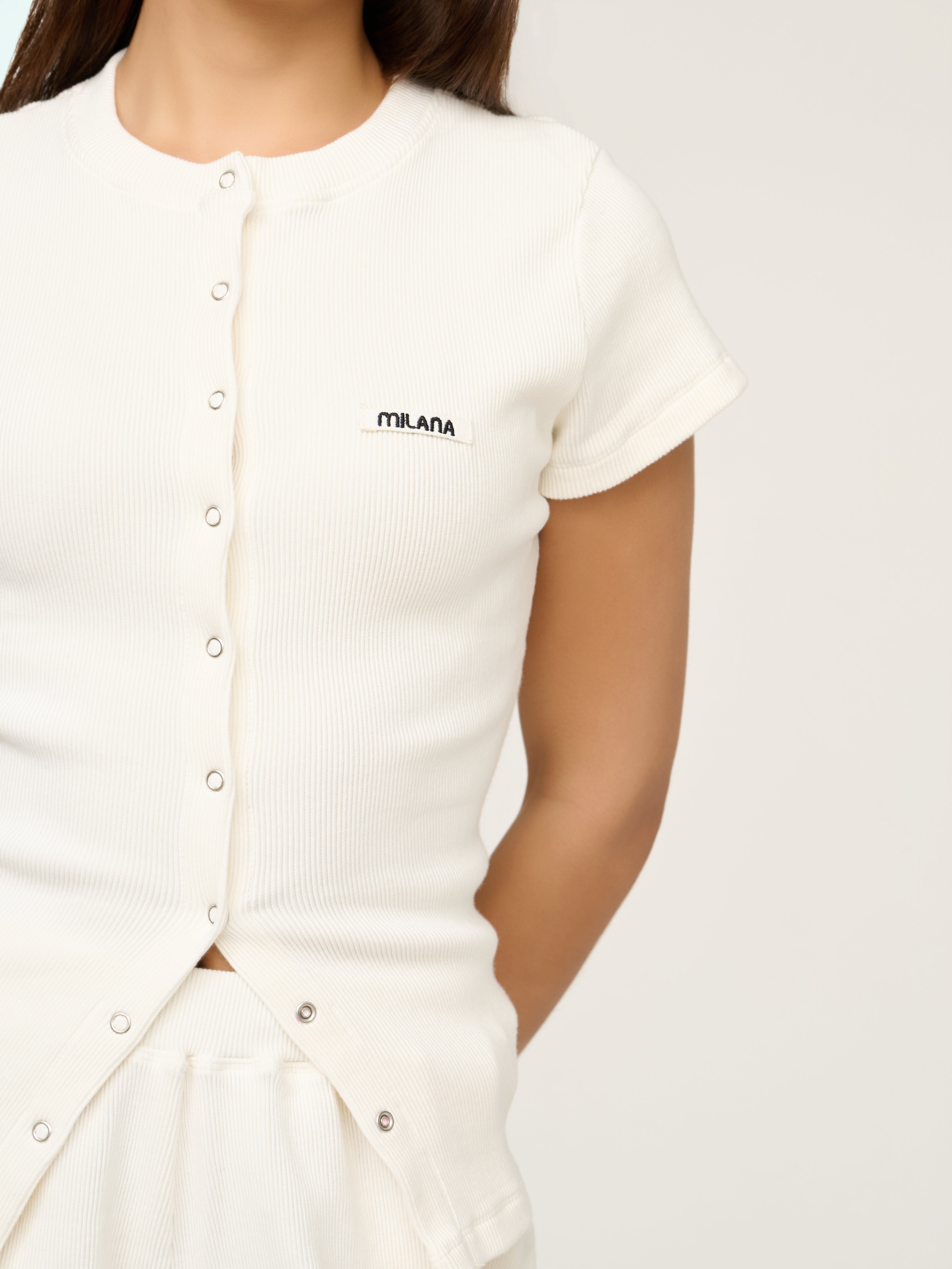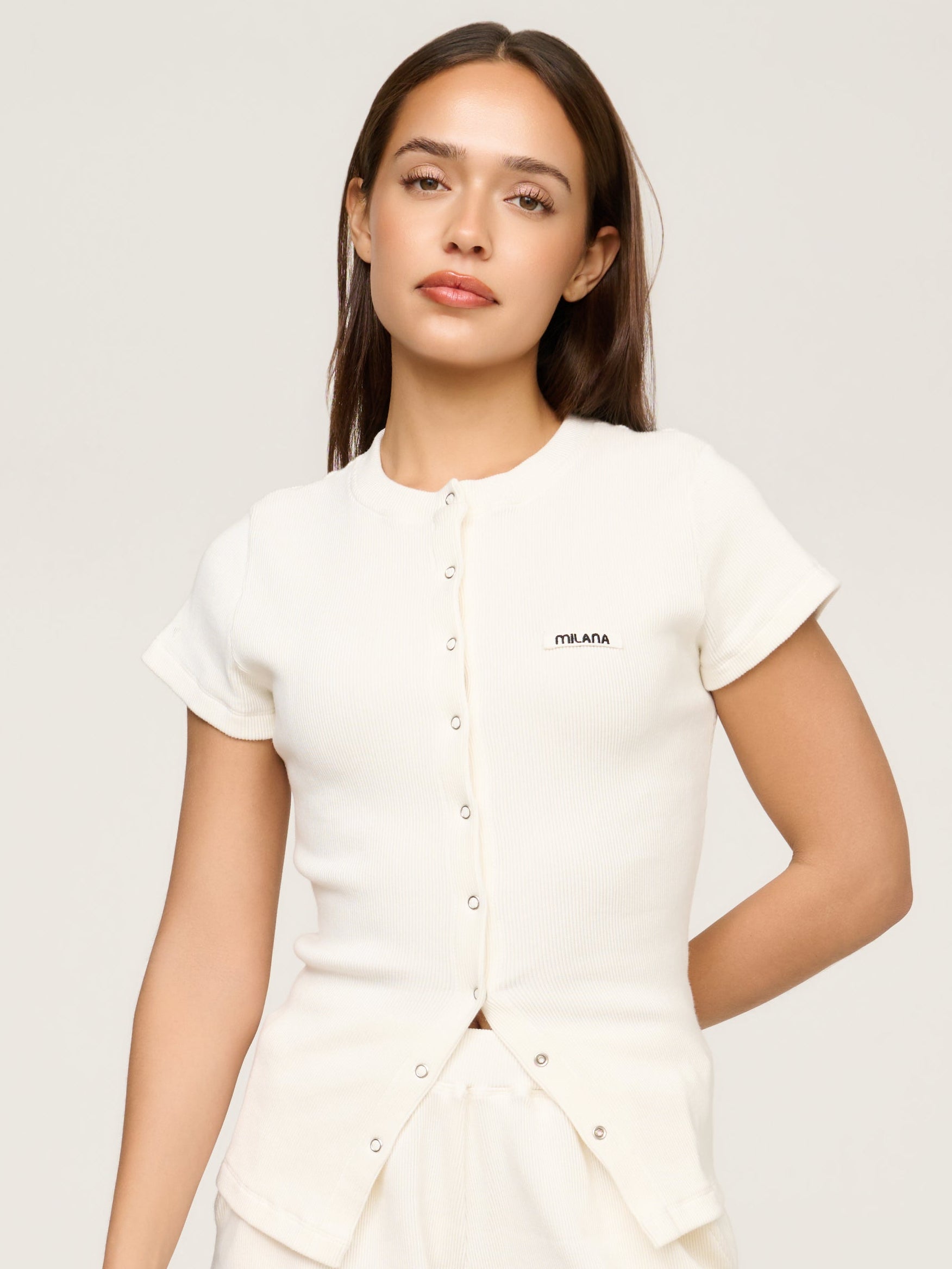 Our most-loved Soft Rib just got an upgrade. Say hello to the Cream Soft Rib Core Button Baby Tee. A fresh take on our signature long sleeve, reimagined with a flattering short sleeve fit. Designed with our signature Milana Core Canvas Patchwork and strong snap buttons that can be altered for your desired fit. Pair with our Soft Rib Shorts for a look that works for any occasion.