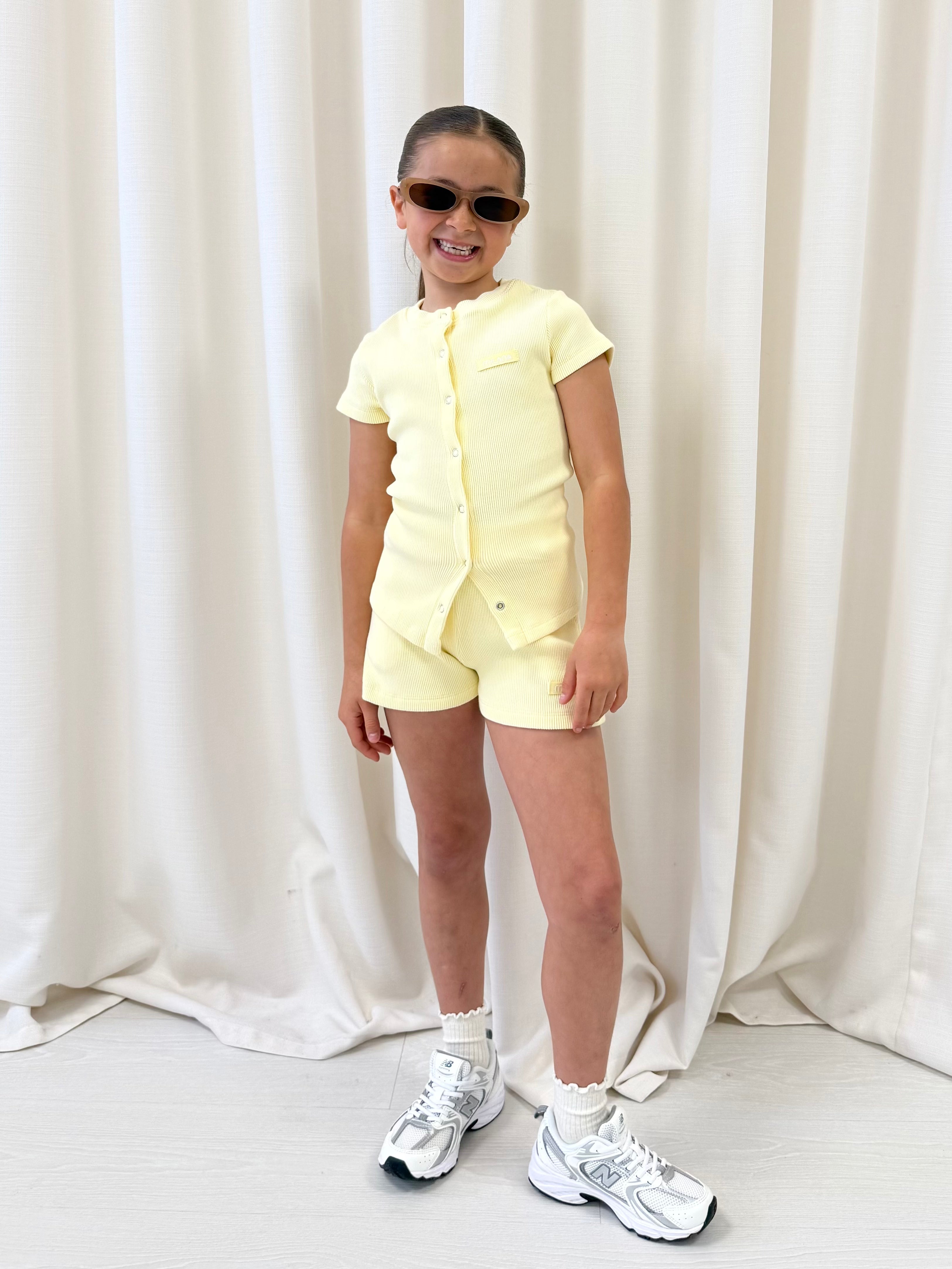 Say hello to the Lemon Soft Rib Mini Shorts — now available in a mini version for your little one. Match with your mini in our soft rib shorts our most comfy shorts to date. Crafted into a looser fit with a slightly higher and elastic waistband and completed with our Milana Core Canvas Patchwork and pull cords. Pair the outfit with our Soft Rib Button Baby Tee, perfect for playing, exploring, and busy days out.