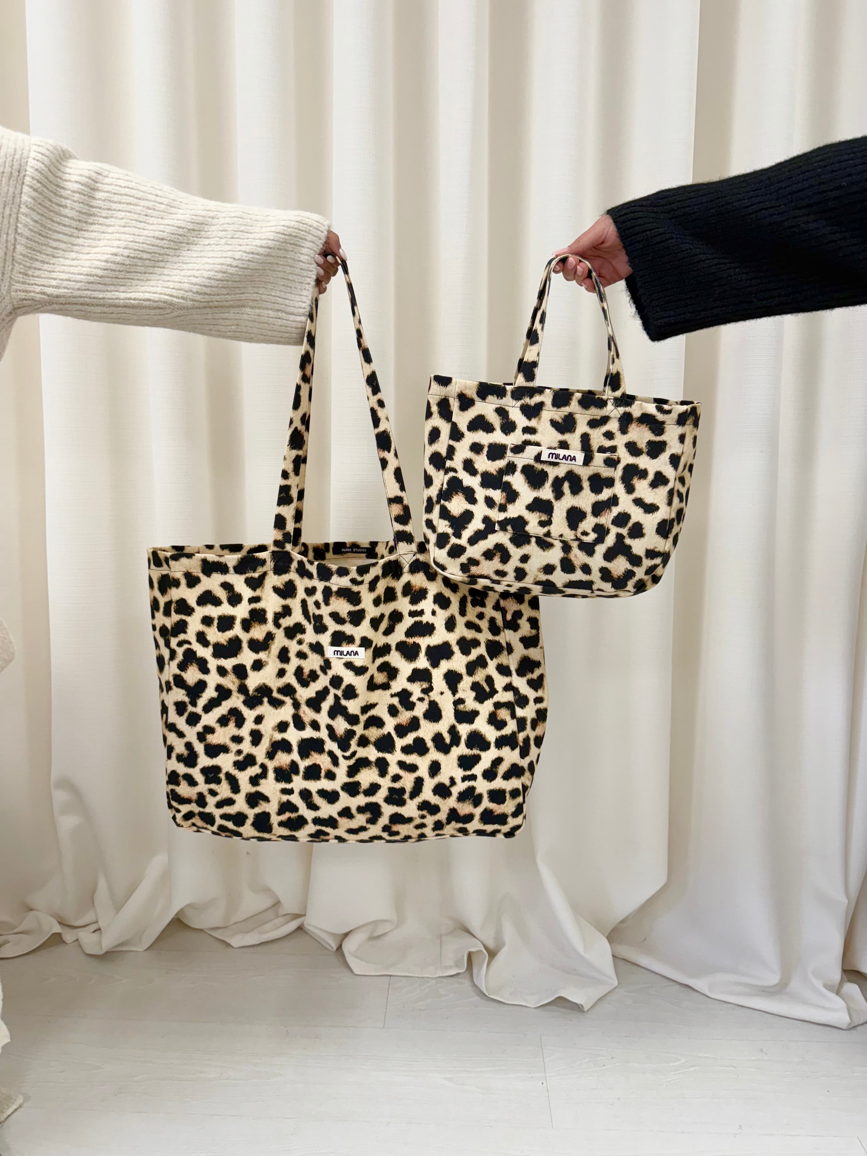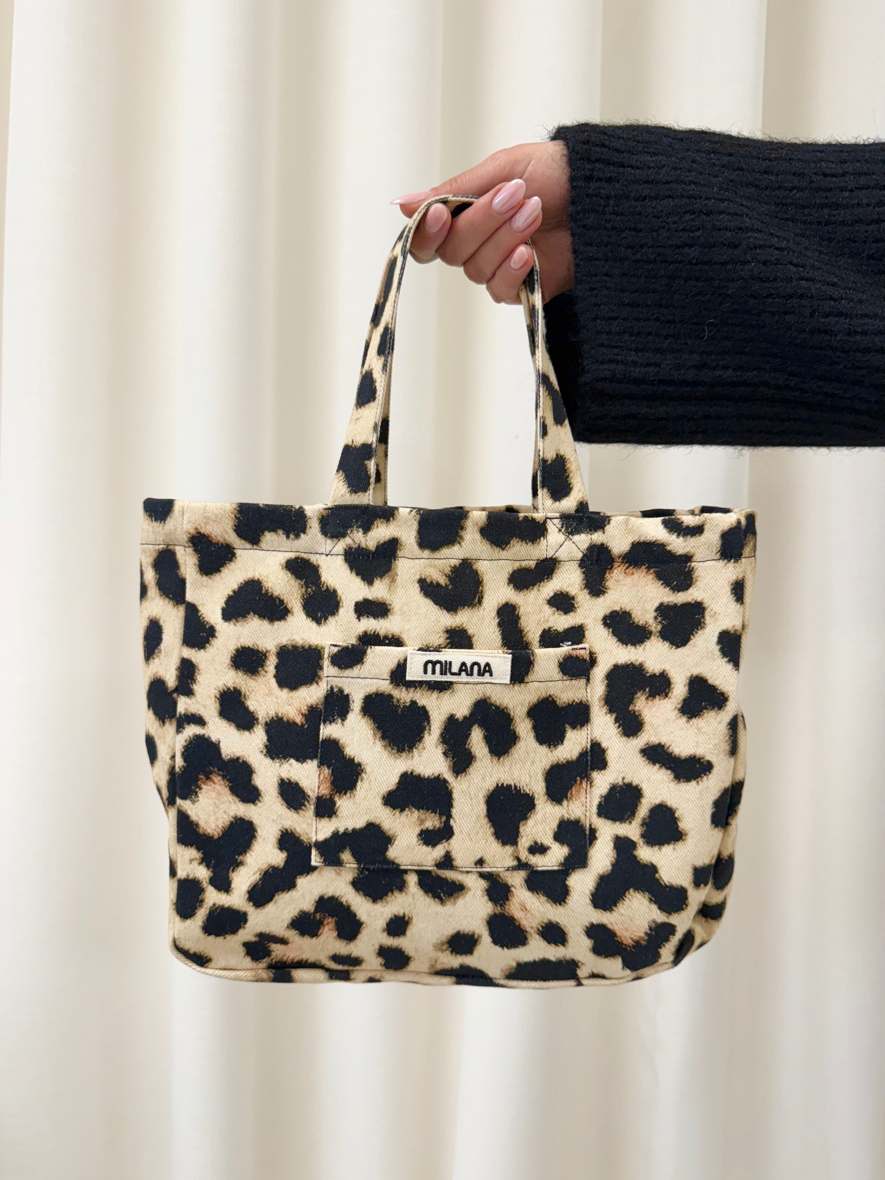 Your everyday wear accessory has landed: the Milana Studios Leopard Mini Tote Bag. Crafted with our signature Milana Canvas Patchwork and designed with a convenient front pocket, this bag brings a bold, elevated touch to any outfit.