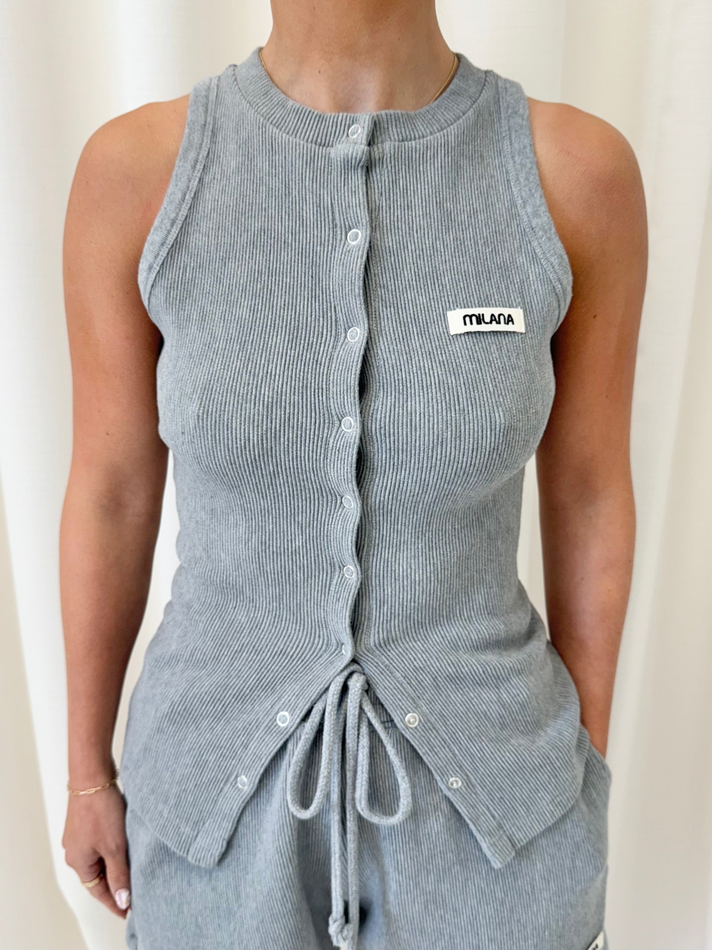 Our most popular Soft Rib material is now here in a vest & short set... Introducing our first ever Core Button Vest. A sleeveless version of our best selling core soft rib button long sleeve. Completed with our Milana Core Canvas Patchwork and strong snap buttons that can be altered for your desired fit. Pair with our Soft Rib Shorts for the ultimate any occasion outfit.