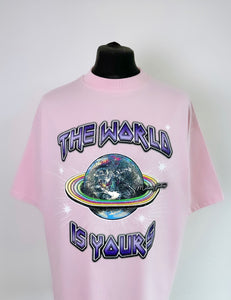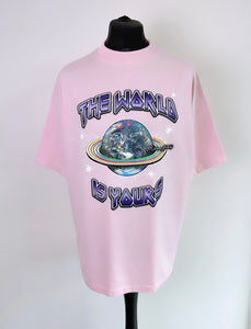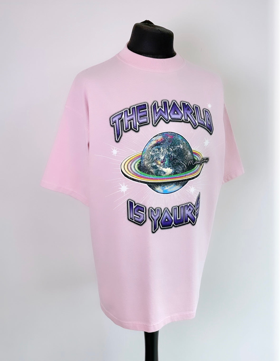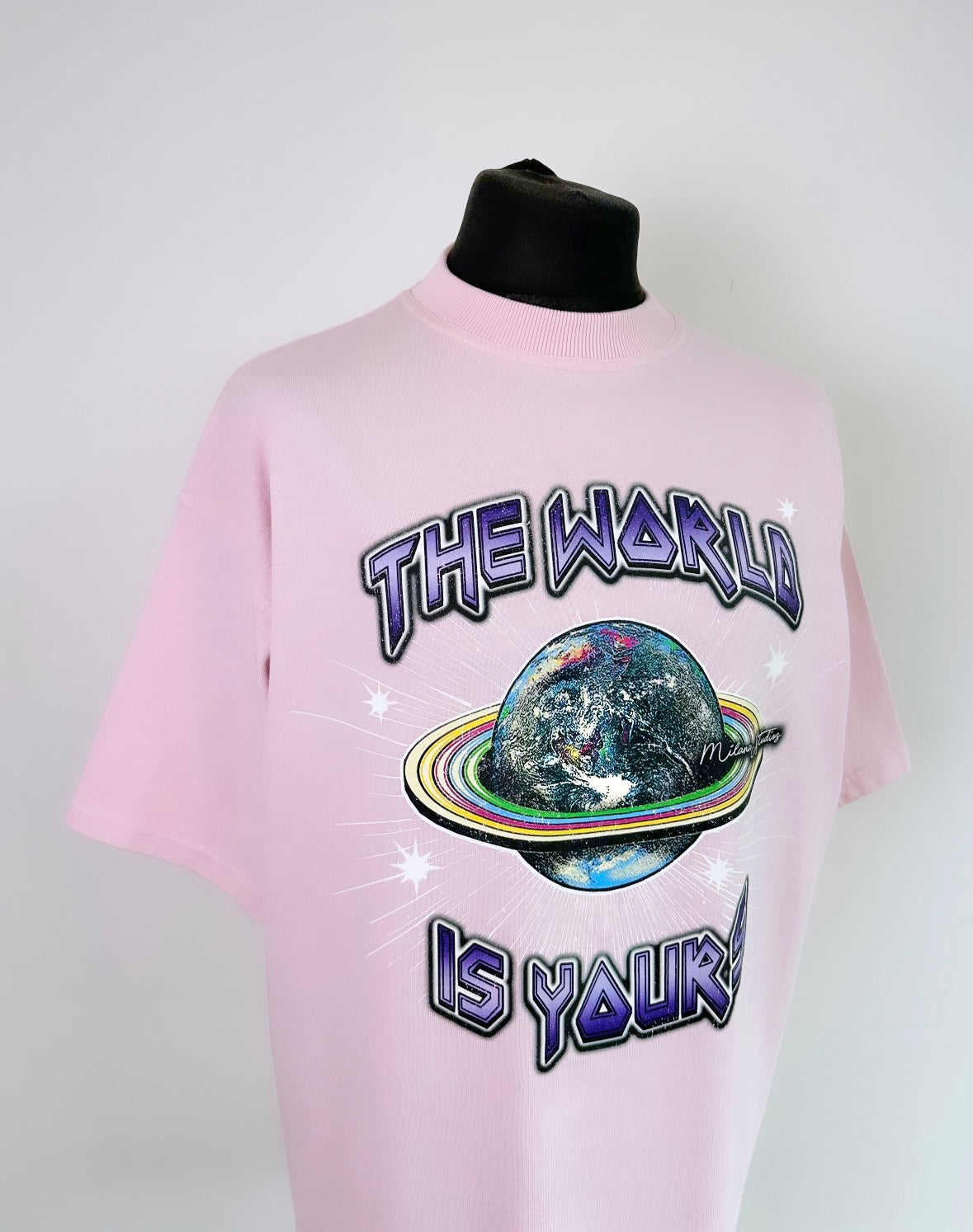 Milana Studios pink heavyweight T-shirt, with distressed graphic work. Crafted into box fit, dropped shoulder, oversized fit for the ultimate wardrobe staple.